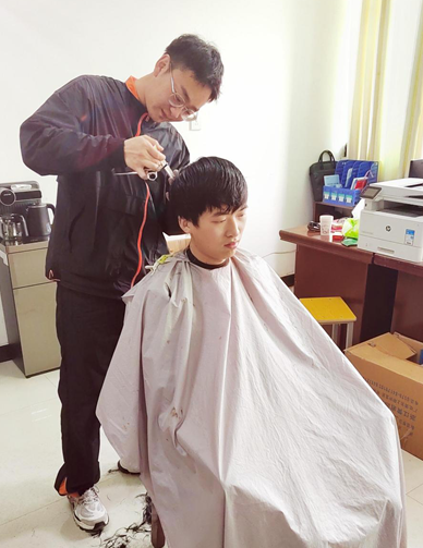 有需要理发的老师同学,需提前预约,测量体温,随理随走,不扎堆不聚集。他技艺娴熟,理得又快又好,每天的“顾客”络绎不绝。每次理发前后,他都会将理发工具进行清洁消毒,以防交叉感染。理发过程中对待同学们非常亲切,大家都称他为“最美理发师”。