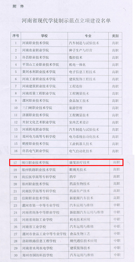 12月30日,河南省教育厅公布河南省首批现代学徒制示范点立项建设名单,周口职业技术学院康复治疗技术专业成功入选。此次获批河南省现代学徒制示范点建设项目,是世界杯多年来深化产教融合、校企合作的成果,标志着在线买世界杯平台在校企合作共育人才的培养模式实践探索方面又有了更大的进步,同时也为在线买世界杯平台高质量发展再添新的亮点。