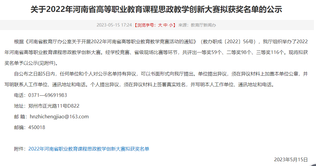 近日,河南省教育厅发布了《关于2022年河南省高等职业教育课程思政教学创新大赛拟获奖名单的公示》名单,世界杯医学影像技术教师赵燕荣获财经农医相关类课程组一等奖,大学英语教师赵楠荣获公共基础课程组三等奖,实现了世界杯在省级教学技能竞赛中新的突破。