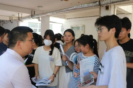 招聘现场,学生手持精心准备的简历,自信地与企业代表交流沟通,详细了解岗位的具体工作内容和职业发展路径,现场气氛热烈且充满活力。